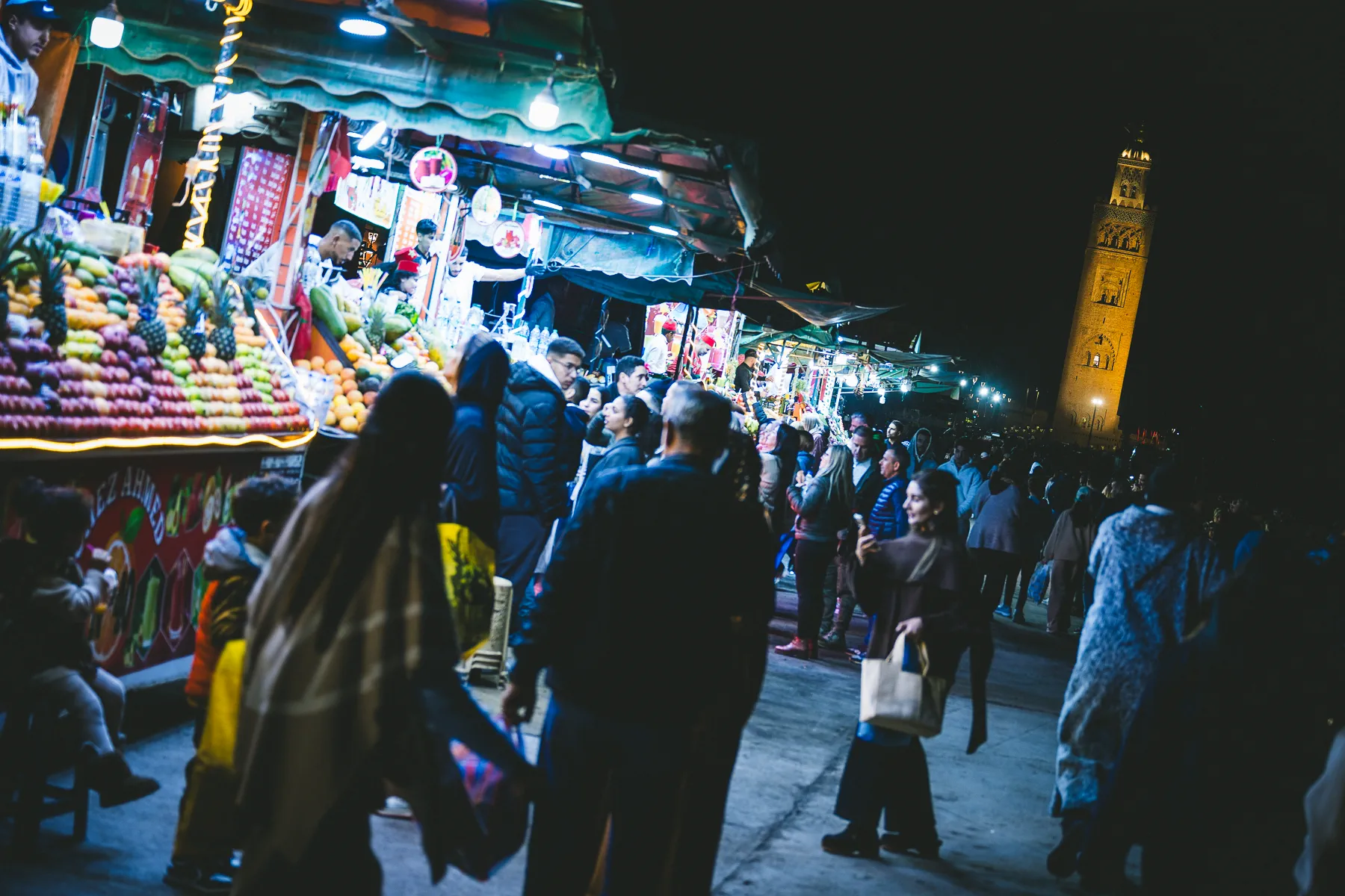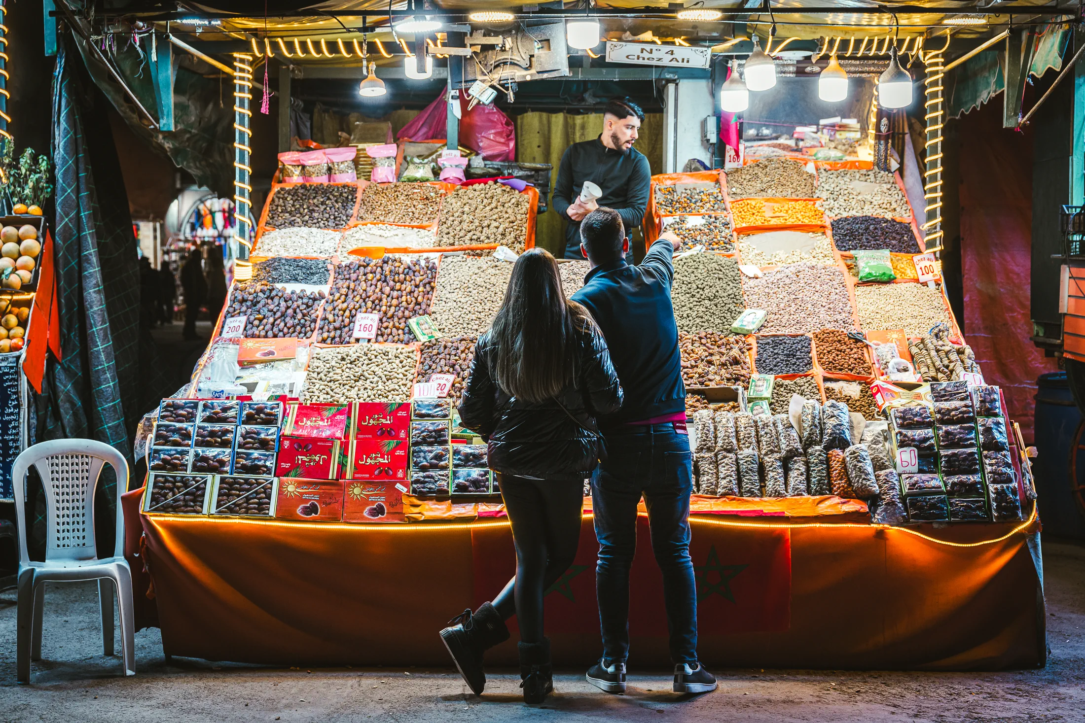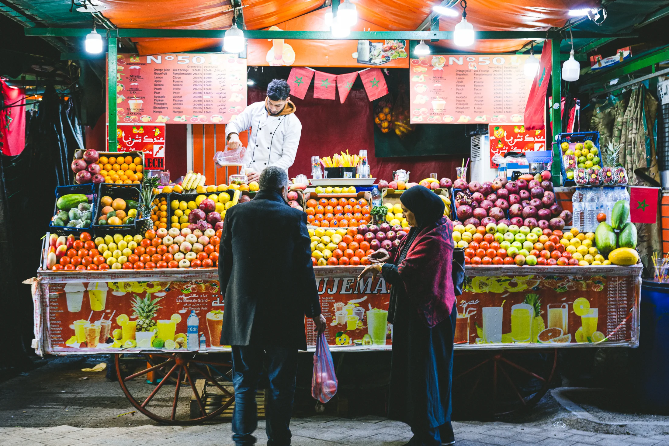 Freshly squeezed, loudly advertised. The food carts in Jemaa el-Fna – the square and marketplace in the medina quarter of the city – offer great eats and great smells, and very enthusiastic pitches of what’s on offer. Samples, even. Juices to dates, seafood to desserts. It’s magic. And that’s just the perimeter.