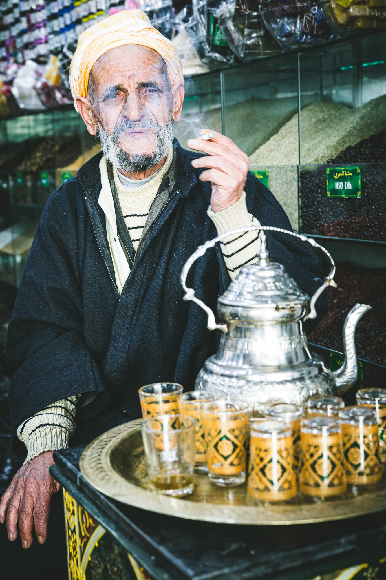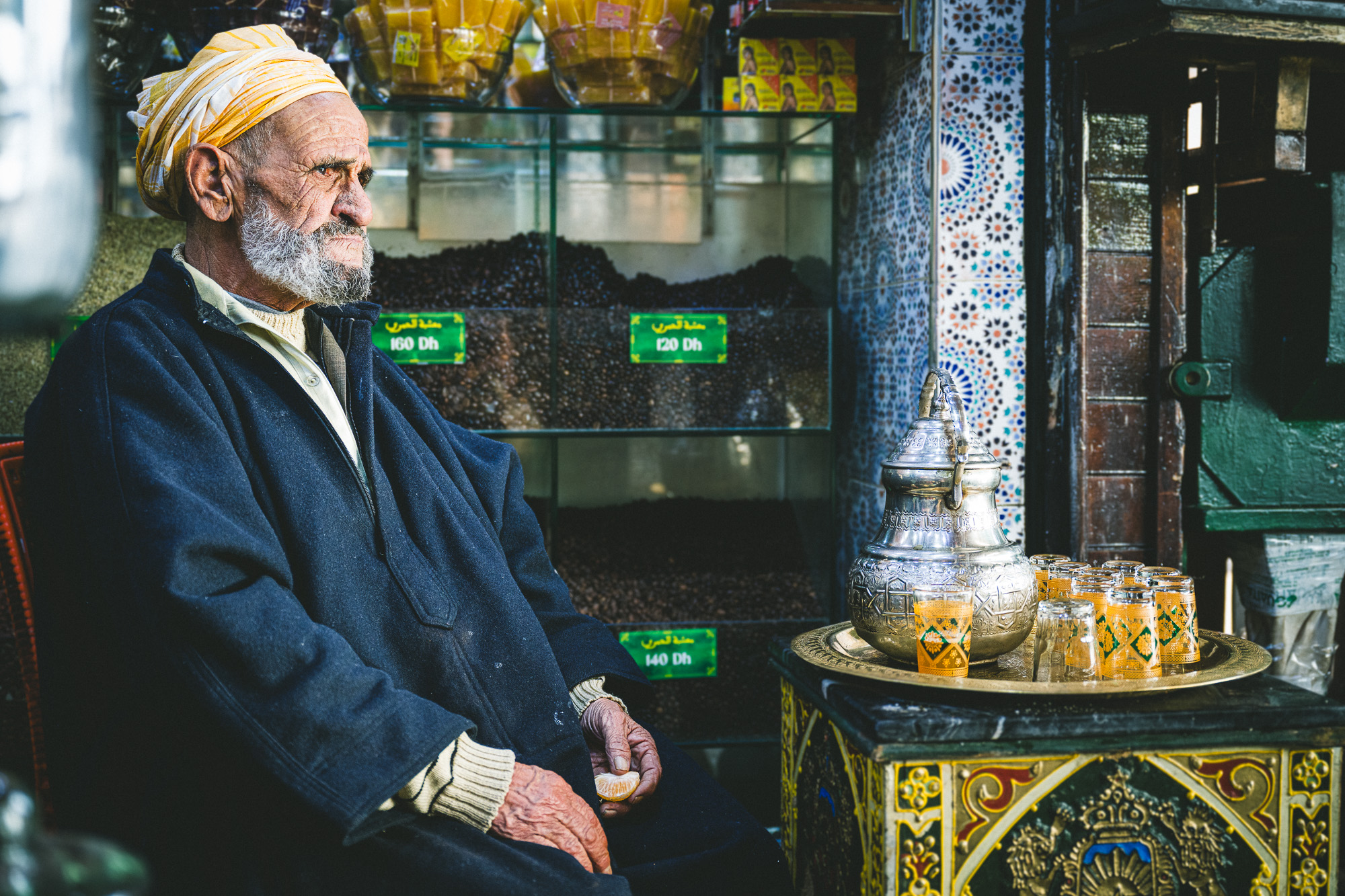 I picked 3 kinds. A 35-spice blend for beef and lamb, a 4-spice blend for fish and chicken, and a curry lemon combination for chicken, like the skewers grilled all over the market. While powders were weighed and bags were prepped, the shop owner brought fresh oranges to share. I said hello to his father, sitting at the side of the shop entryway, and knew I needed to photograph him.
